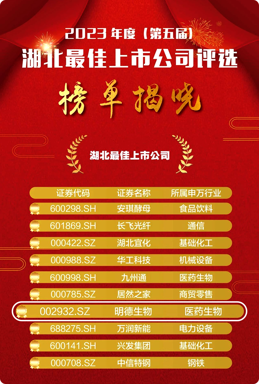 近日,由湖北日報傳媒集團主辦的“2023年度(第五屆)湖北最佳上市公司”評選活動公布獲獎名單,武漢明德生物科技股份有限公司獲得