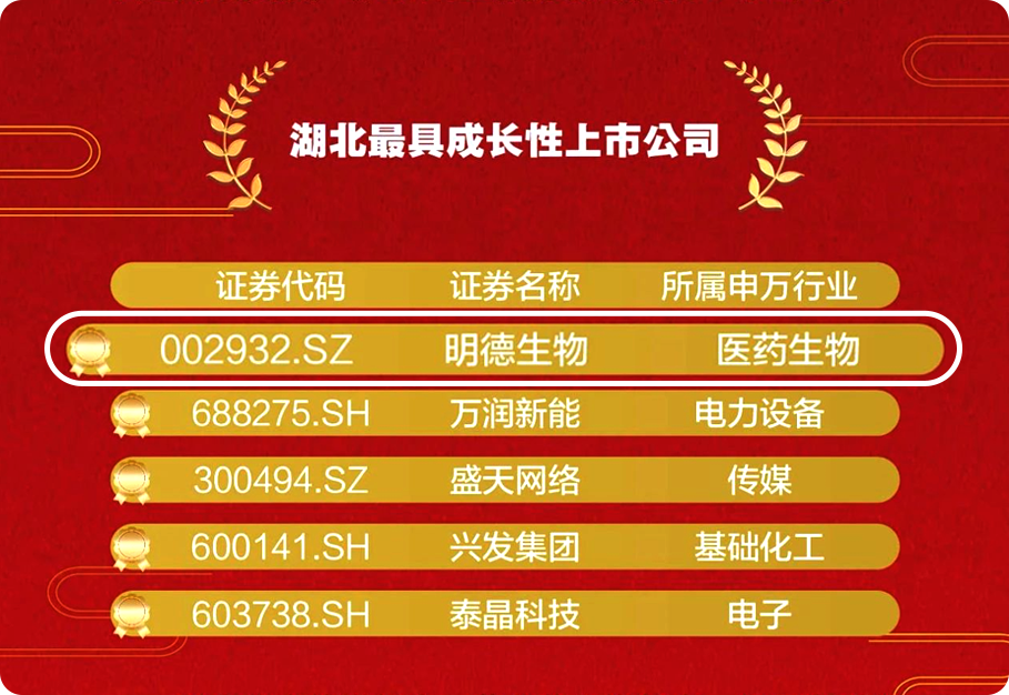 入圍公司在經營業績、規范治理、市場認可度、投資回報、社會責任等方面均表現突出,是引領湖北上市公司高質量發展的領軍企業。明德生物連續多年蟬聯榜單,體現了湖北資本板塊對企業高質量發展的認可。