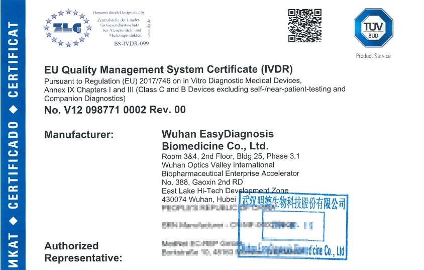 近日,明德生物免疫熒光系列8個產品獲得由國際獨立第三方檢測、檢驗和認證機構德國南德在IVDR新法規下簽發的CLASS C的CE證書,成為國內首批獲得歐盟新體外診斷醫療器械法規IVDR認證的制造商,同時也是明德生物的產品在繼3月份血氣試劑盒后再次獲得IVDR認證。