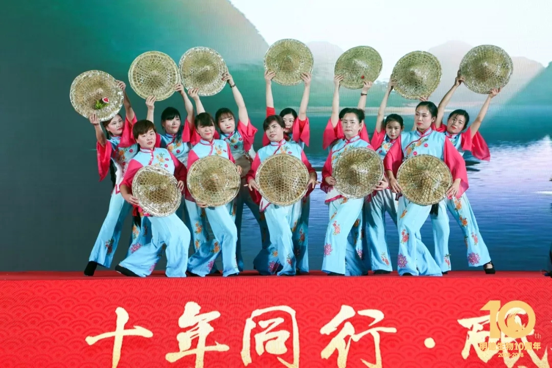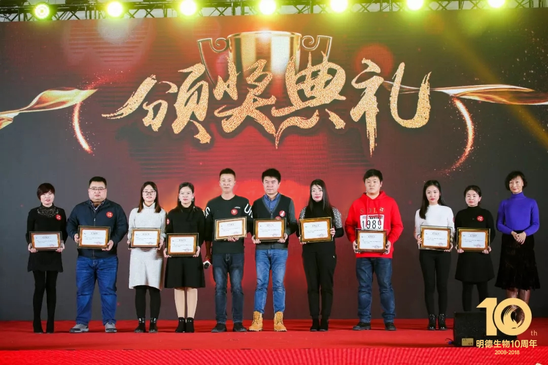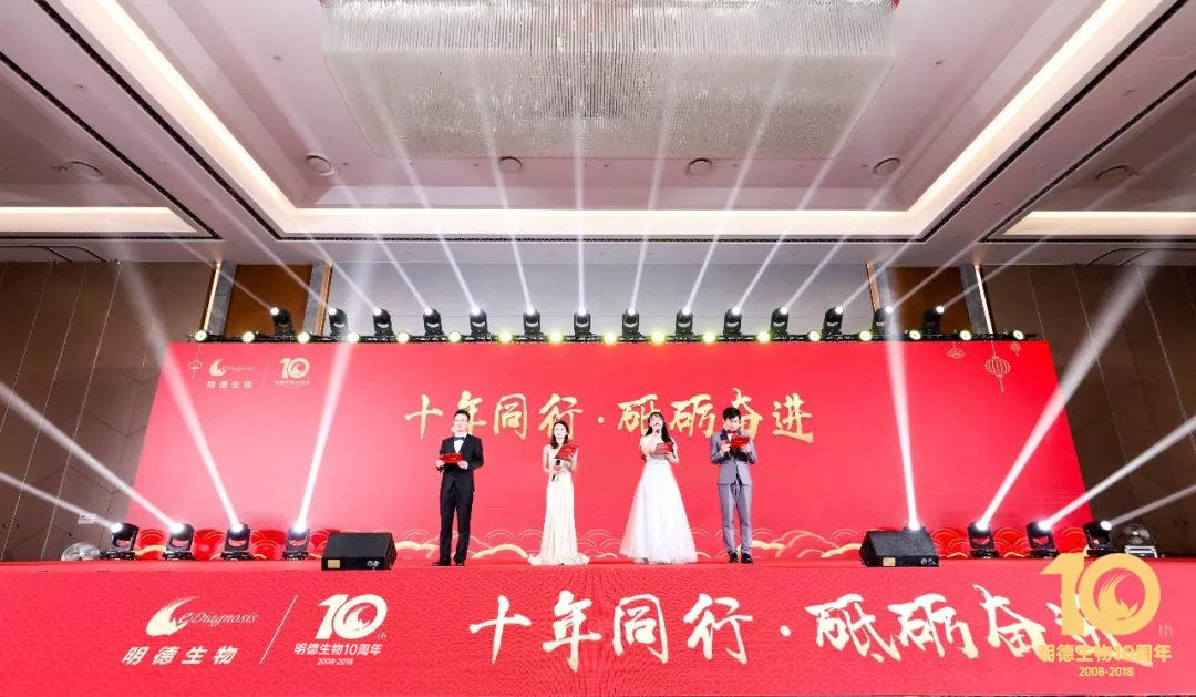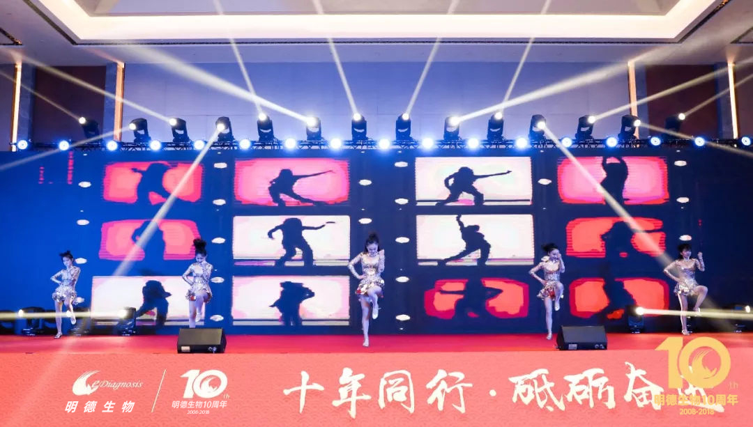 年度盛典以一場紅紅火火的《鼓舞未來》完美開場,隆隆的鼓聲擊得現場熱烈歡騰,四位主持人盛裝登臺為明德家人送上了新年祝福,總結了2018年明德人共同收獲的累累碩果,2018年是明德生物成立的第10個年頭,10年風雨同舟,10年披荊斬棘,10年砥礪前行!這一路的輝煌與成就飽含了每一個明德人辛勤的耕耘與默默付出。