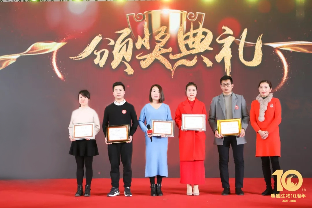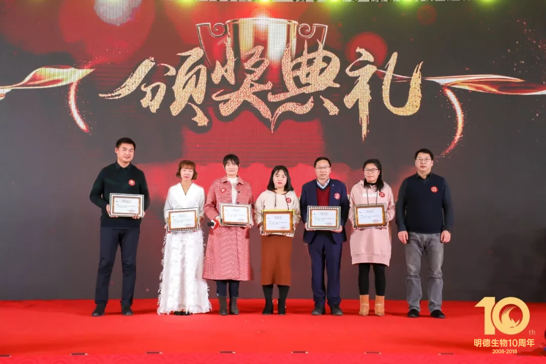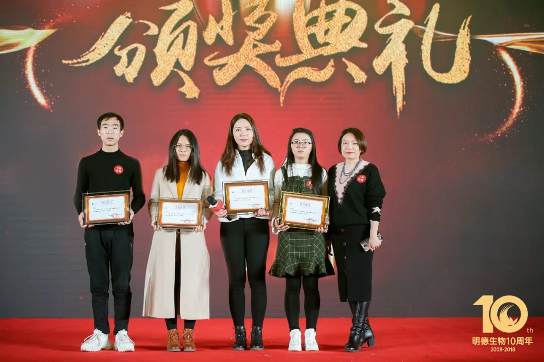 精彩的頒獎典禮開始了,頒獎分為兩輪,首先隆重頒發的是明德生物2018年度優秀新員工、文化之星、績效之星、領導力成長之星四個獎項。緊接著,生產部帶來了充滿詩情畫意的舞蹈《水墨漓江美》。接下來,王穎總再一次登上舞臺親自主持了第二輪頒獎,依次頒發了明德生物2018年度卓越創新研發貢獻獎、總經辦特殊貢獻個人獎及團隊獎、五周年員工獎等獎項!給予了優秀的明德人及卓越的明德團隊高度的肯定和激勵!