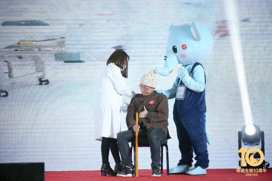 10周年蛋糕緩緩推上臺,全場起立唱生日歌,祝愿明德生物10歲生日快樂!共祝愿,明德好,共祝愿,明天好!