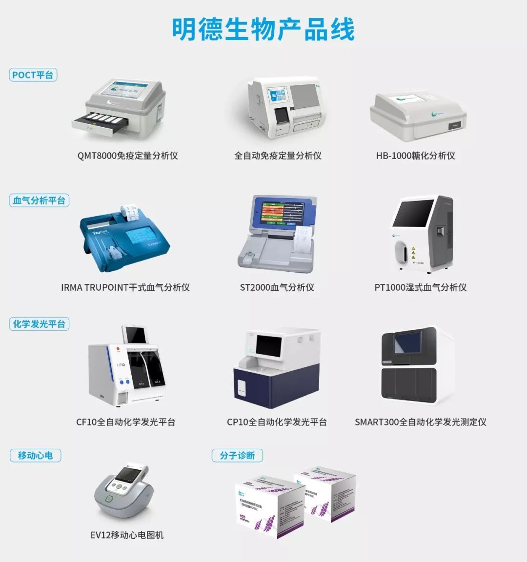 本屆CACLP,明德生物將隆重展出:POCT化學(xué)發(fā)光平臺、分子診斷產(chǎn)品、干/濕式血氣分析平臺、胸痛中心及心電網(wǎng)絡(luò)全面解決方案,及新糖化產(chǎn)品、POCT產(chǎn)品等。
