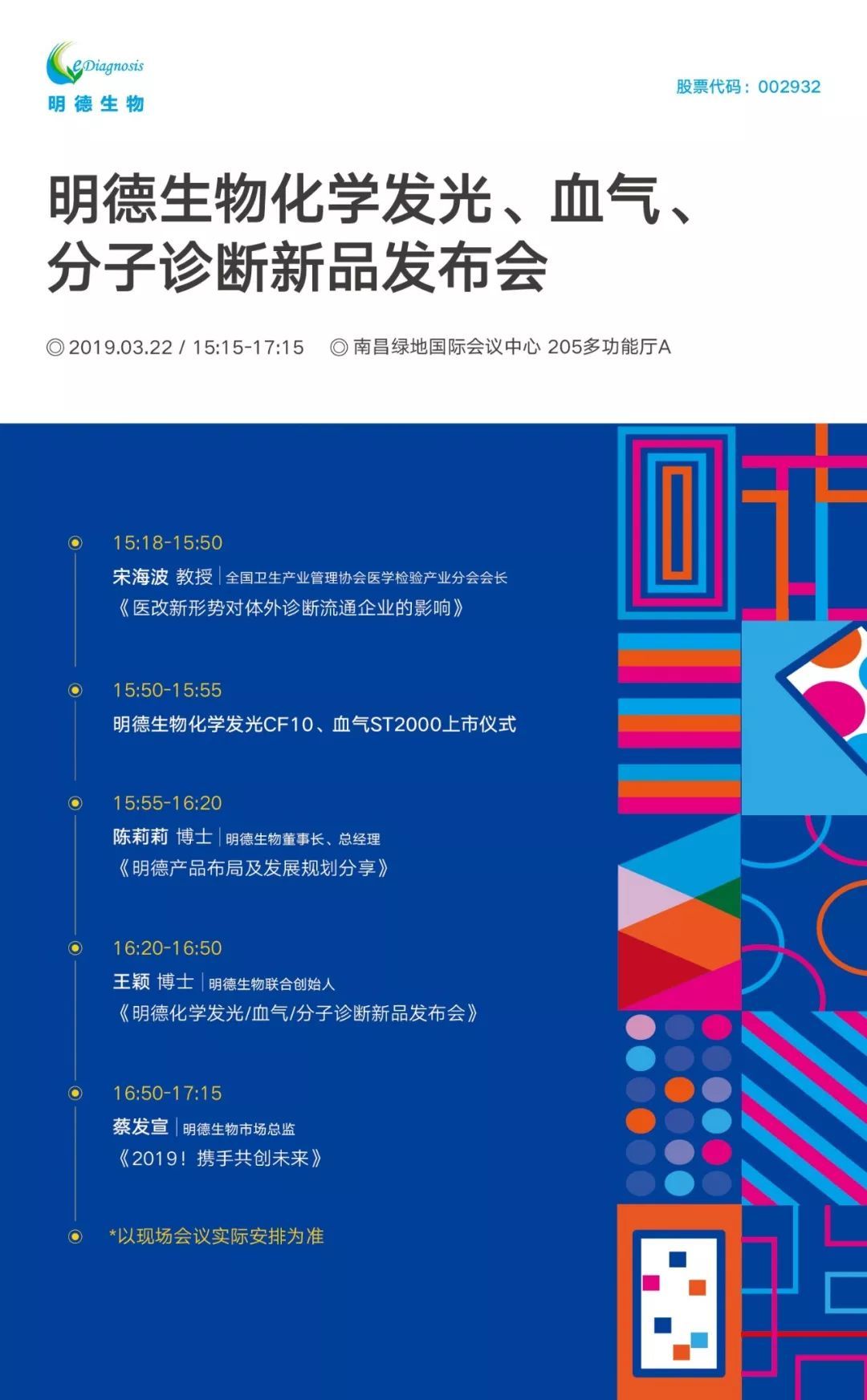 更值得期待的是,3月22日下午15:15-17:15,明德生物將在南昌國際博覽城綠地鉑瑞酒店會議中心 205多功能廳A舉行新產品發布會,發布POCT化學發光、血氣分析、分子診斷等多款新品。
