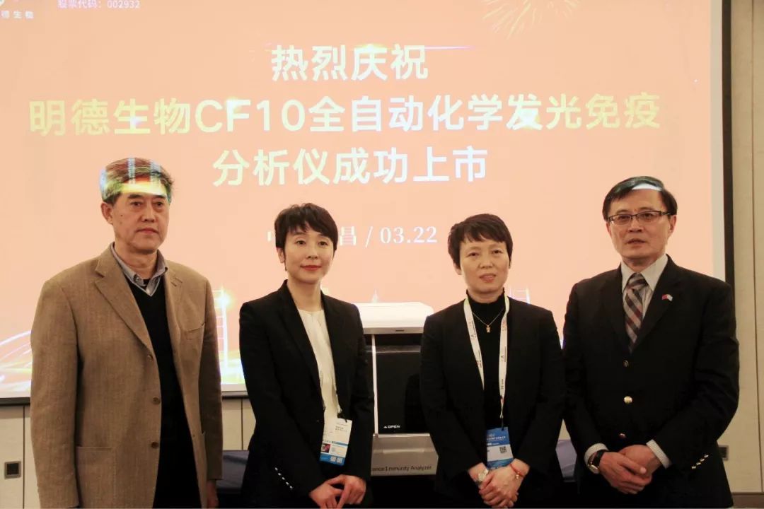 在宋海波會長、居軍主任、陳莉莉博士、王穎博士的共同揭幕下,明德生物小型全血POCT化學發光免疫分析儀CF10完美亮相。