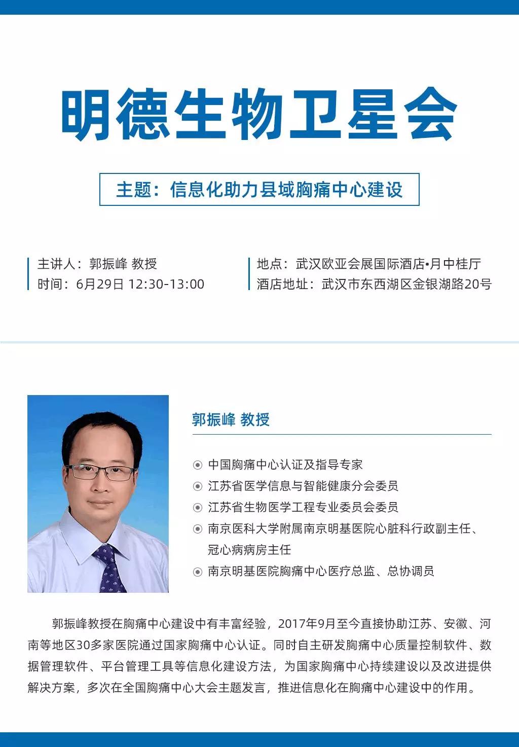 作為國內首家提出胸痛中心一體化建設解決方案的IVD國家高新技術企業(yè),明德生物將在大會舉辦期間召開胸痛中心專題衛(wèi)星會。特別邀請中國胸痛中心認證及指導專家、南京醫(yī)科大學附屬南京明基醫(yī)院冠心病病房主任、胸痛中心醫(yī)療總監(jiān)、總協(xié)調員郭振峰教授就《信息化助力縣域胸痛中心建設》主題作精彩分享,會議由胸痛中心武漢認證辦公室主任張勇教授主持。