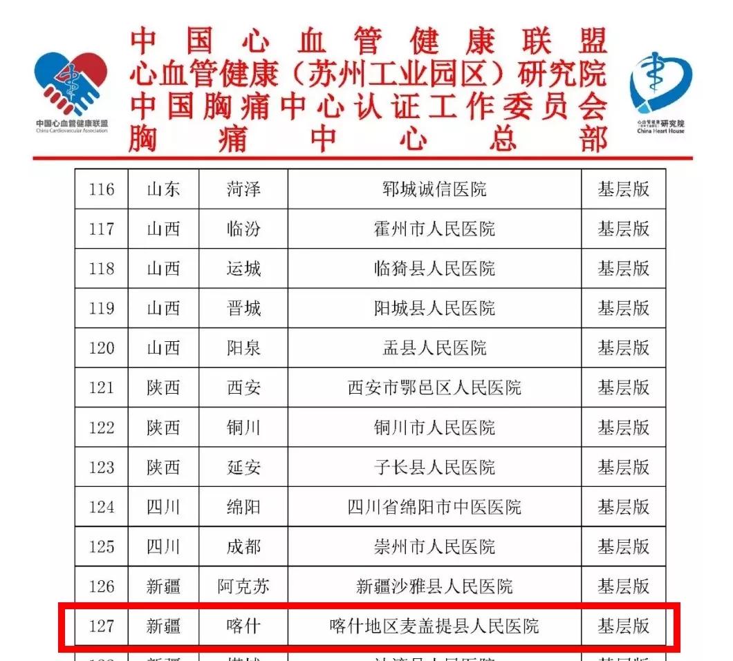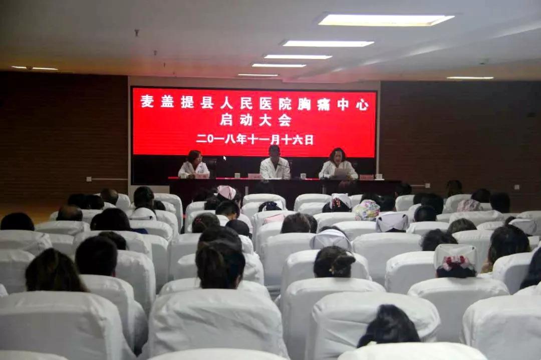 2018年11月16日,麥蓋提縣人民醫院胸痛中心啟動大會召開,2019年3月開始申報,4月整改通過網審和省聯盟預檢,5月通過專家網審,6月暗訪和現場核查,7月高效通過胸痛中心總部認證。
