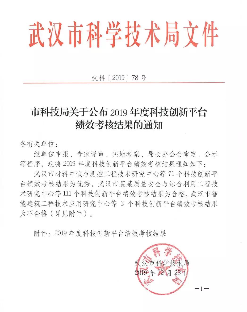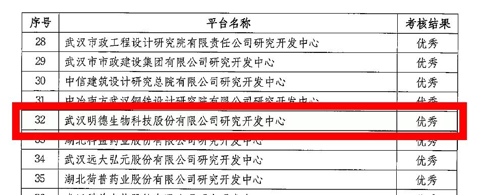 2019年12月23日,武漢市科學技術局發布了《市科技局關于公布2019年度科技創新平臺績效考核結果的通知》,武漢明德生物科技股份有限公司研究開發中心考核結果為優秀!