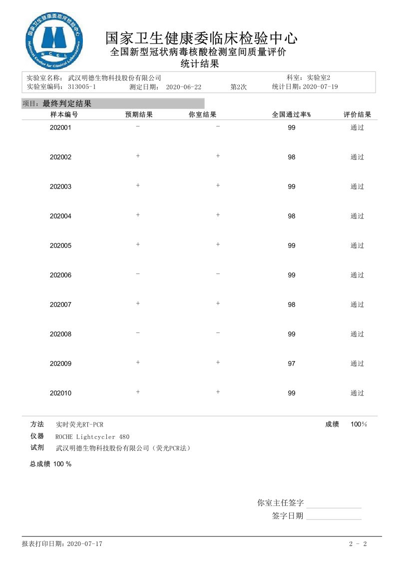近日,武漢明德生物科技股份有限公司滿分通過國家衛生健康委臨床檢驗中心組織的2020年第二次全國新型冠狀病毒核酸檢測室間質量評價。