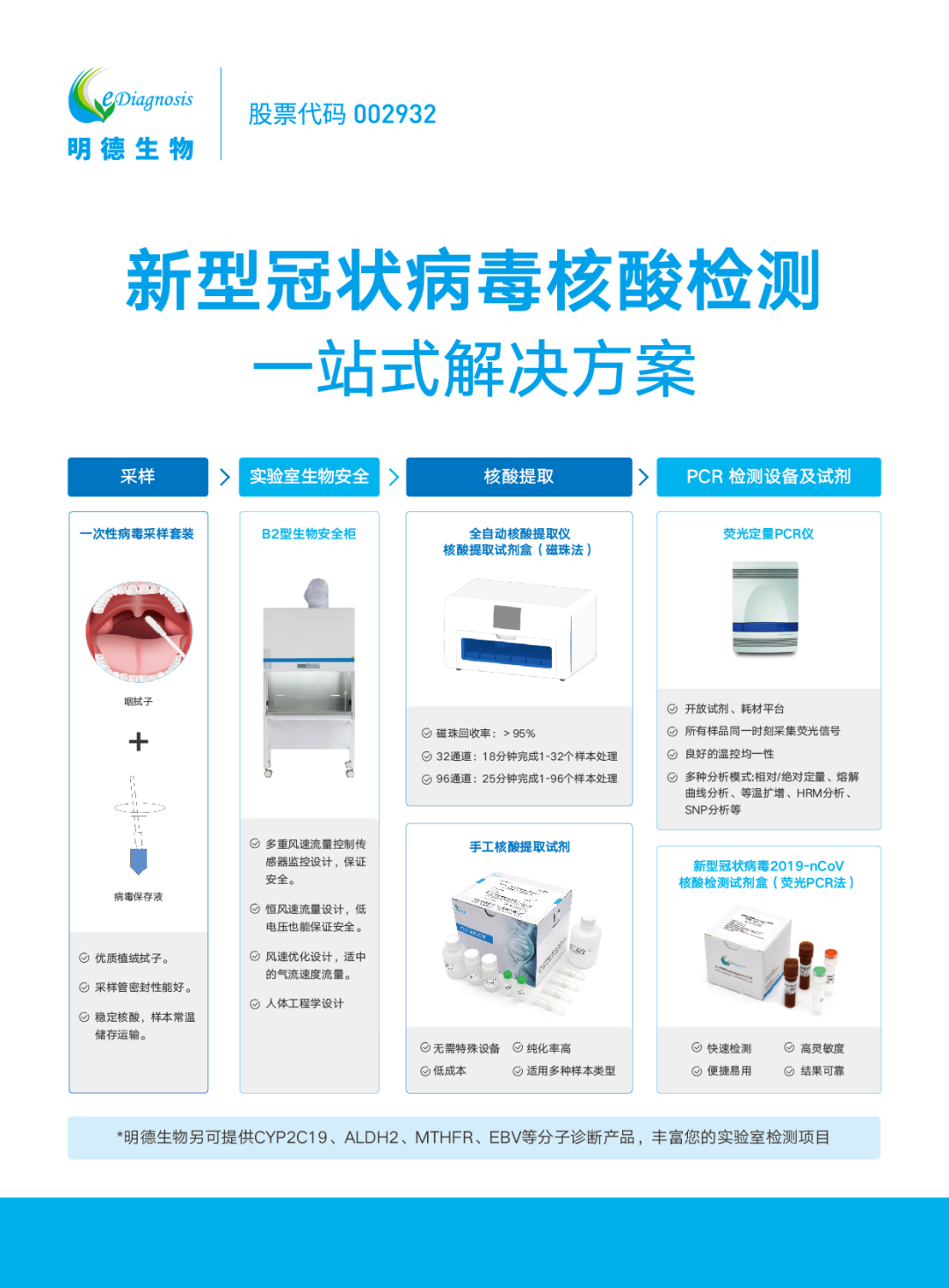 明德生物秉承“創新即時診斷 引領智慧醫療”的企業使命,不斷推陳出新,除新冠核酸檢測試劑盒外,更先后推出一站式新冠核酸檢測解決方案和PCR實驗室建設方案,為各級醫療機構疫情防控工作高效有序的開展作出了貢獻。