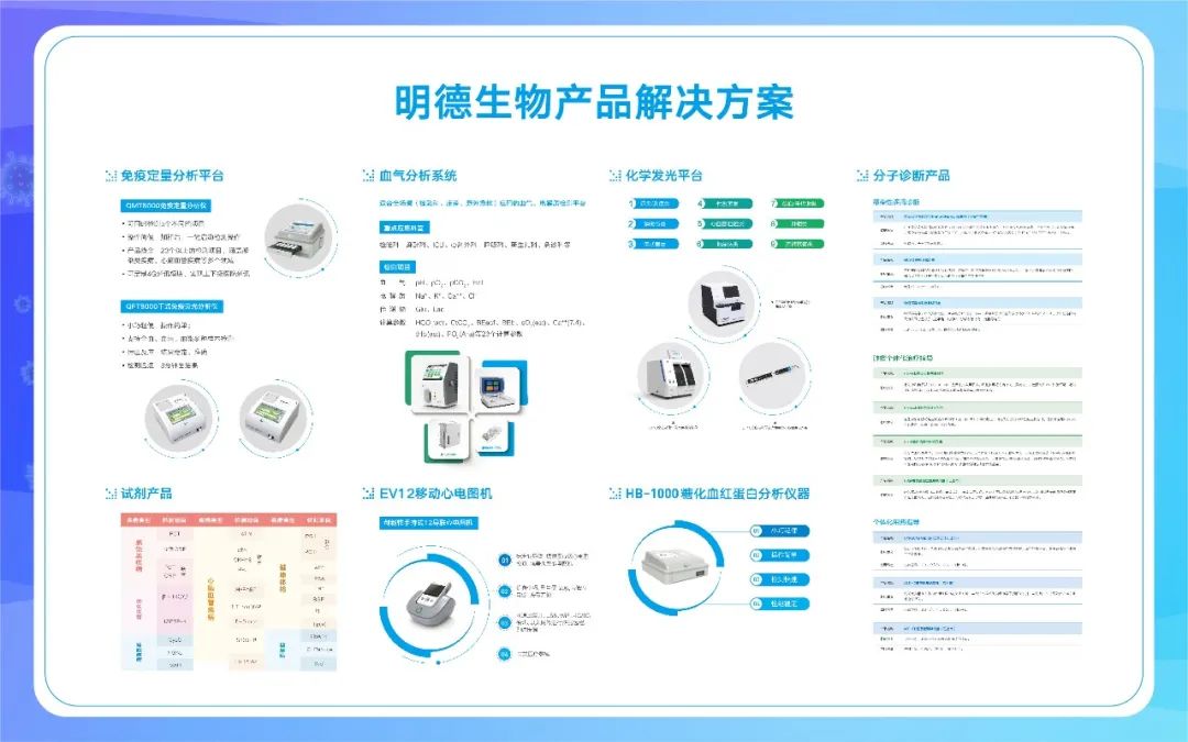 此次展會,明德生物攜發熱門診智能化建設、PCR實驗室建設、急危重癥一體化等醫療服務方案和POCT、化學發光、血氣分析、分子診斷等檢測平臺及配套試劑精彩亮相!