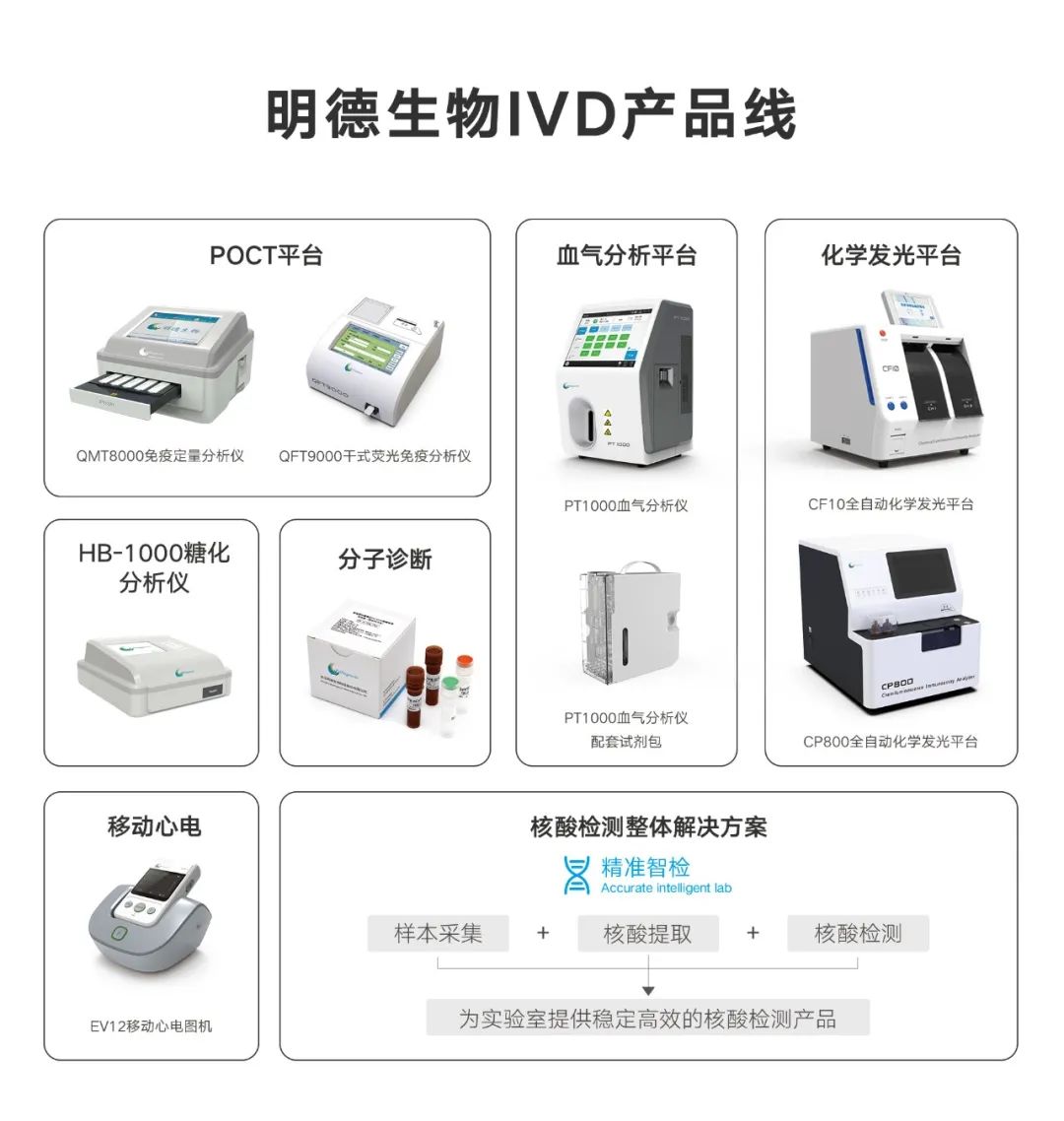 明德生物攜急危重癥救治一站式解決方案和即時診斷產品(CF10化學發光平臺、PT1000血氣分析平臺、QMT8000POCT平臺、EV12心電圖機)精彩亮相。