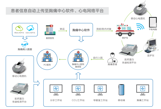 明德生物提供胸痛中心軟硬件一體化服務,胸痛中心軟件為胸痛中心建設中高度集成化軟件系統,流程軟件集合了所有胸痛患者治療過程中的標準動作,且硬件數據自動接入,控制了胸痛流程的相關數據的產生過程, 實現了數據的自動采集以及審核過程的數據溯源、避免了數據造假以及丟失的情況,并可進行數據的實時分析以及質量管理。