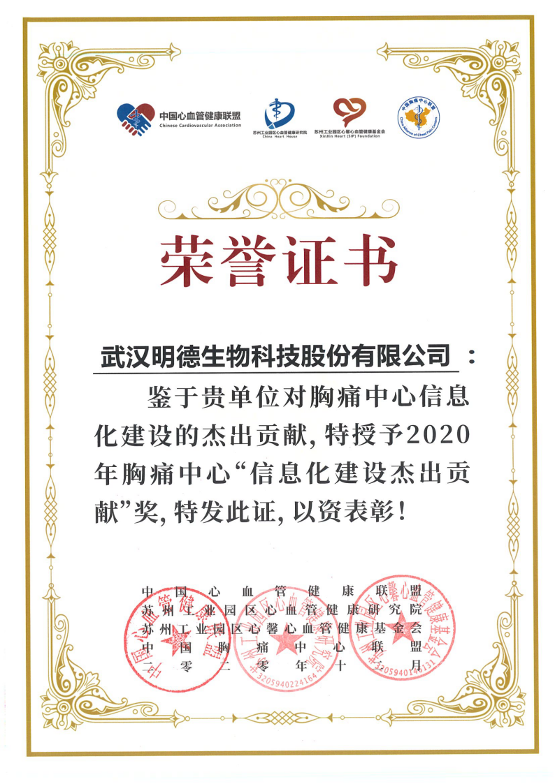 2020年12月召開的全國第十屆胸痛大會上,明德生物斬獲“信息化建設杰出貢獻”獎項。明德生物合作的武鳴區中醫醫院、十堰市太和醫院及英山縣人民醫院三家醫院也分別取得了“智慧胸痛中心建設優秀獎”獲得行業肯定。