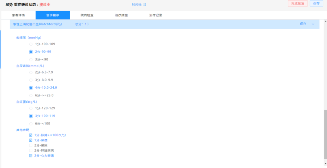 根據2020版上消化道出血的專家共識,高危急性上消化道出血患者應進行緊急處置,如容量復蘇、輸血、血管活性藥物應用及初始藥物治療等。明德上消化道出血急危重癥救治系統通過點選的方式進行快捷的記錄,簡化操作流程的同時,保證治療措施完整記錄。