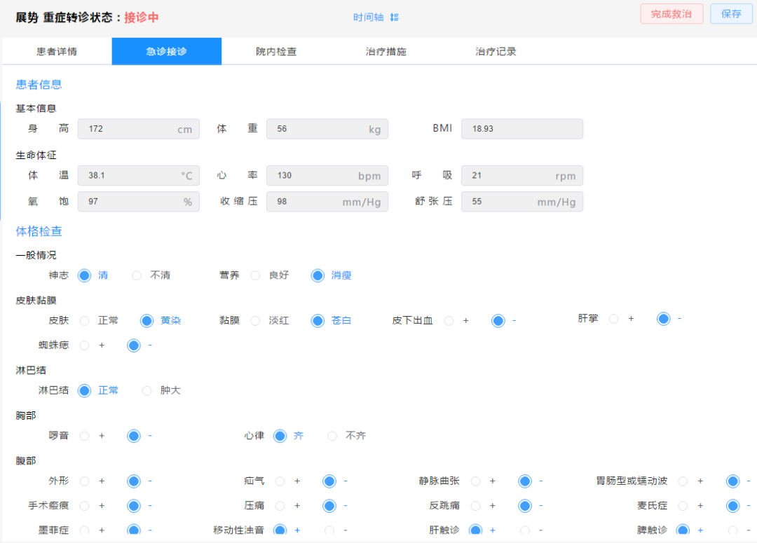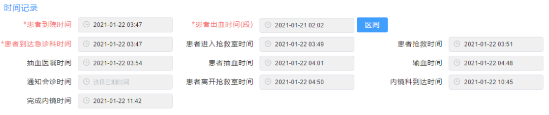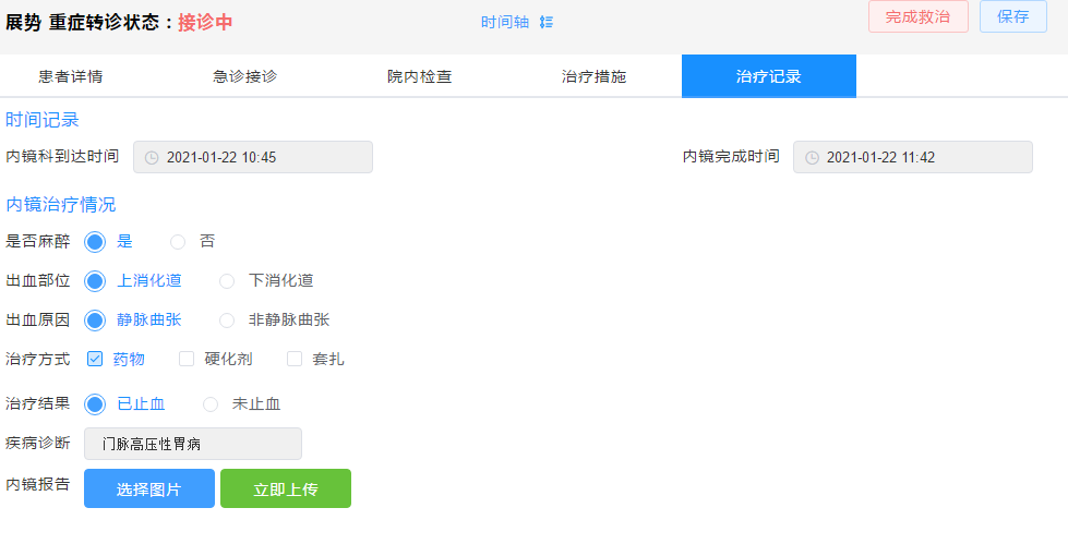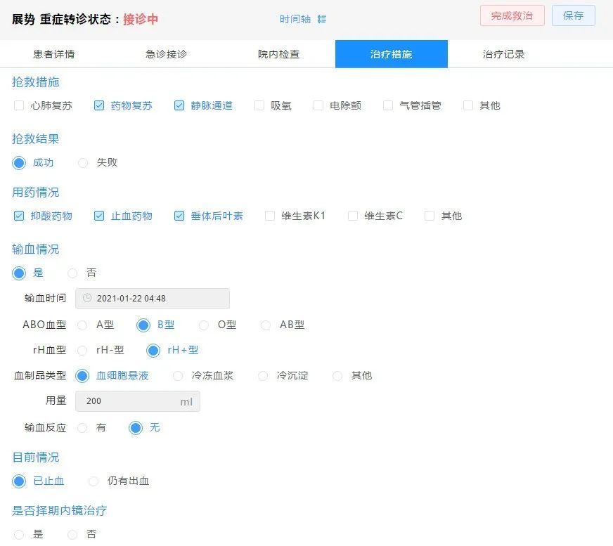 初步病情判斷過后,診斷及快速救治則成了核心問題。由于上消化道出血這一病種的特殊性,成就了其“邊治療、邊診斷”的救治特點,如何搶救,輸血,用藥及急診內鏡的使用決策,與患者的病情變化息息相關。明德上消化道出血急危重癥救治系統即采用“邊診治、邊記錄”的方法,完整記錄患者的全救治流程及關鍵時間點并形成時間軸,以此滿足其就診特點,從用藥和其他治療手段及時展開救治并反復驗證其根本病因。