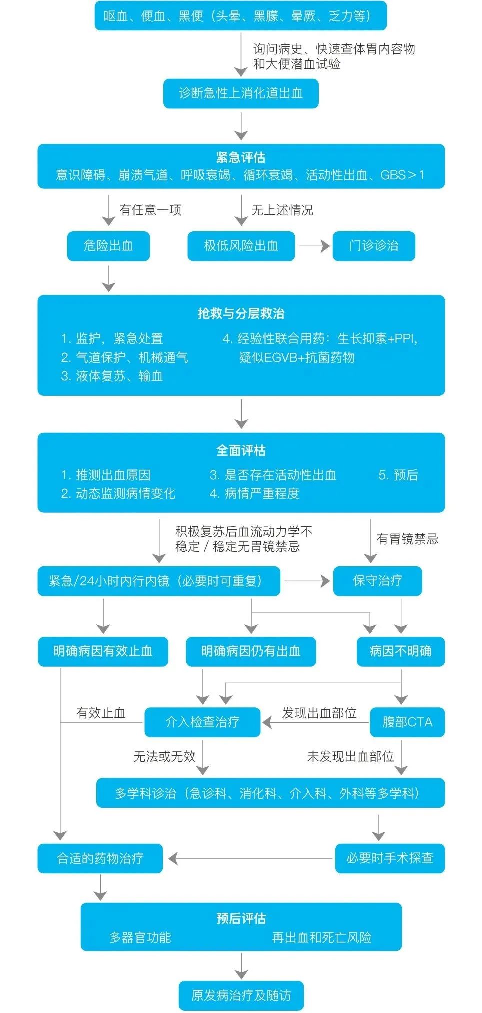 此次共識仍秉承急診“降階梯思維”的理念,按照“3次評估、2次治療”的方法對急性上消化道出血急診診治流程進行構建,力求臨床的可操作性和實用性。