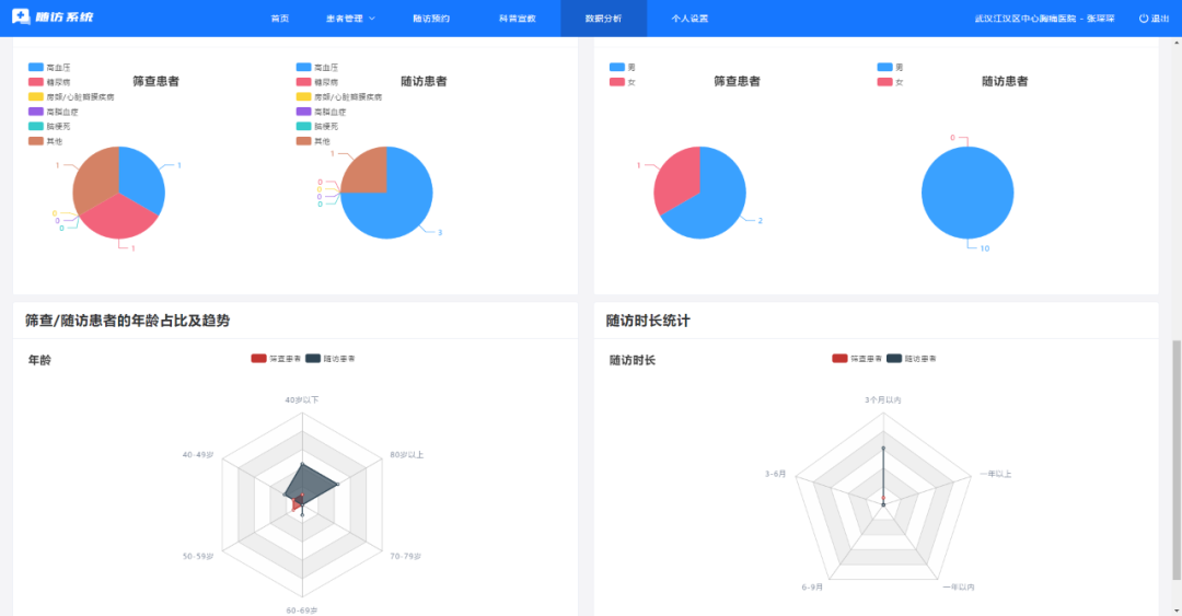 面向醫護,隨訪平臺提供了患者檔案管理,高危患者的篩查,日常隨訪計劃執行及隨訪內容記錄,同時可根據患者的需求推送相關科普宣教內容,此外將數據形成報表及圖表提供給醫護以進行病情及工作情況的分析。