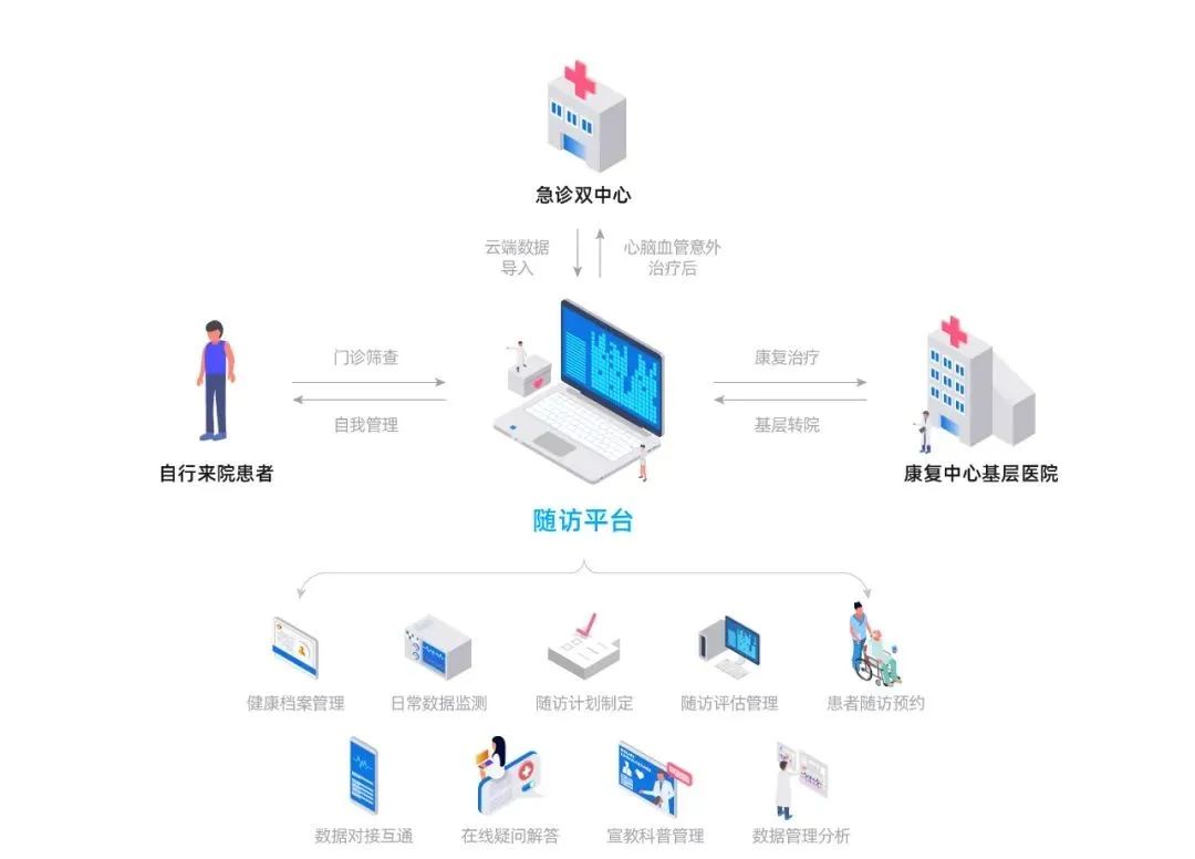 從醫院實際需求出發,結合國家胸痛中心政策要求,力求解決醫患依從性不夠,隨訪記錄零散,數據未錄入系統,以及大量隨訪療效無法監測等問題,融合急危重癥雙中心建設平臺,搭建完整的院前-院中-院后診療閉環,完成篩防、治、管一體隨訪平臺建設。