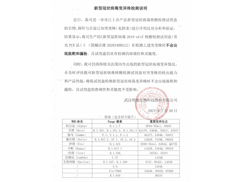 為迎戰新冠變異毒株,明德生物對已上市產品新型冠狀病毒核酸檢測試劑盒的引物、探針與目前已知突變株(包括但不限于阿爾法突變株、貝塔突變株、伽馬突變株、德爾塔突變株、伊塔突變株、卡帕突變株、約塔突變株、拉姆達突變株、艾普西隆突變株等)進行序列比對分析和驗證,結果顯示:我司生產的《新型冠狀病毒2019-nCoV核酸檢測試劑盒(熒光PCR法)》(國械注準20203400212)在檢測上述突變株時不會出現脫靶和漏檢,且試劑盒仍具有檢測的準確性、特異性和靈敏度。本次室間質評中取得滿分成績充分驗證了明德新冠核酸試劑檢測變異株的性能。