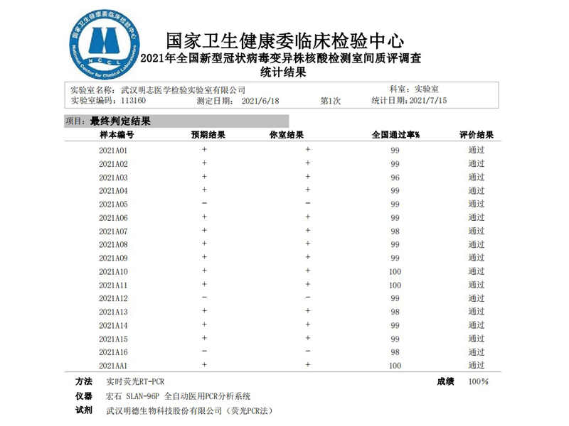 日前,國家衛生健康委臨床檢驗中心發布了2021年全國新冠變異株核酸檢測室間質量評價調查結果(Ⅰ組17份變異株質控品,Ⅱ組16份變異株質控品),顯示使用明德生物生產的新型冠狀病毒2019-nCoV核酸檢測試劑盒均檢測正確,取得100%滿分成績,順利通過!