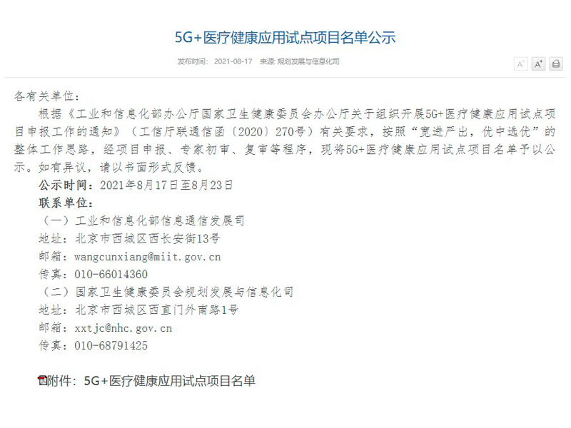 為進一步豐富5G技術(shù)在醫(yī)療健康行業(yè)的應用場景,遴選一批技術(shù)先進、性能優(yōu)越、效果明顯的5G+醫(yī)療健康標志性應用,借此打造行業(yè)標桿,國家工信部、國家衛(wèi)健委于2020年底發(fā)布《關(guān)于組織開展5G+醫(yī)療健康應用試點項目申報工作的通知》,通過建設試點項目,開展智慧醫(yī)療健康設備和應用創(chuàng)新,培育可復制、可推廣的 5G 智慧醫(yī)療健康新產(chǎn)品、新業(yè)態(tài)、新模式。