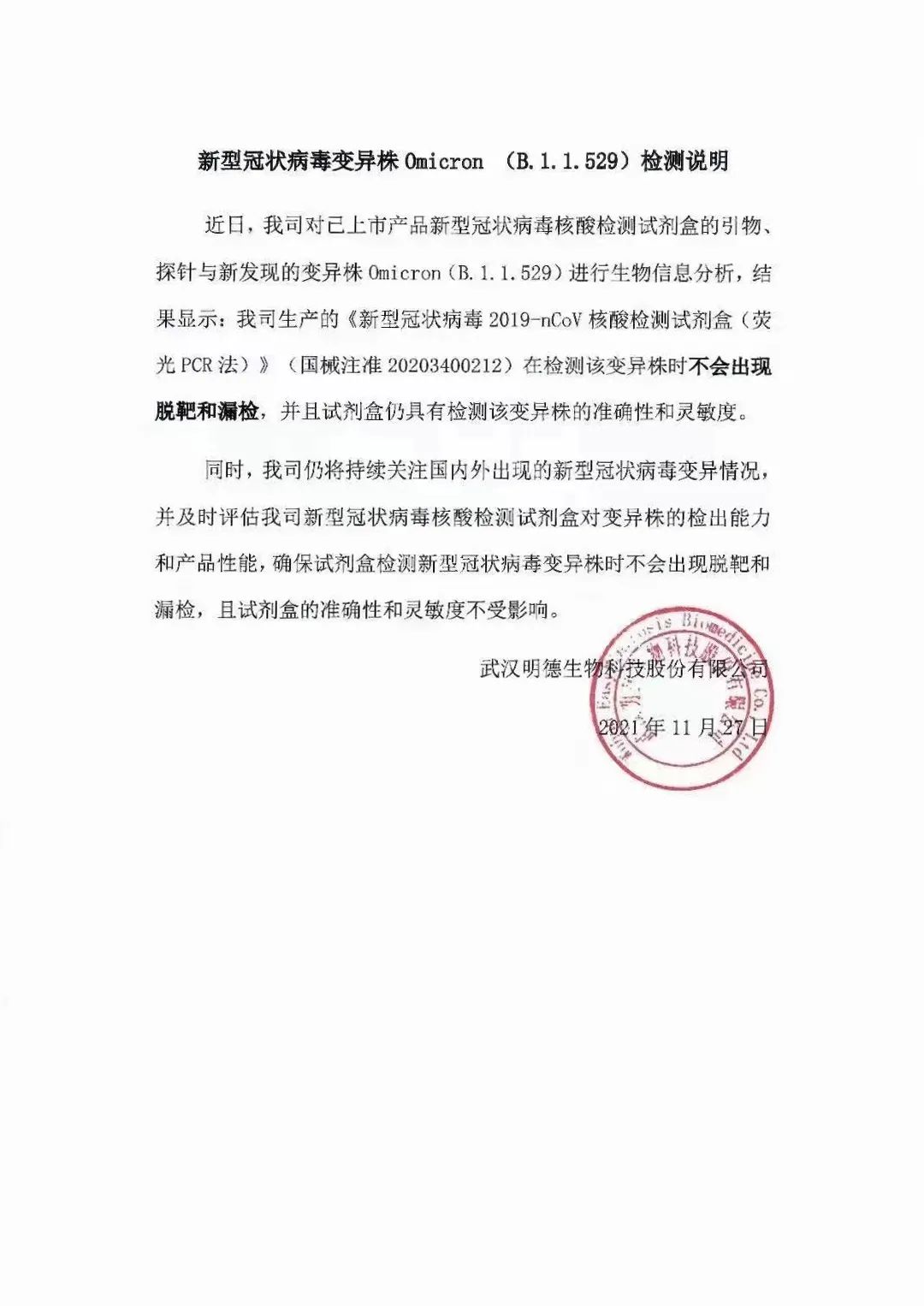 “近日,我司對已上市產品新型冠狀病毒核酸檢測試劑盒的引物、探針與新發現的變異株Omicron(B.1.1.529)進行生物信息分析,結果顯示:我司生產的新型冠狀病毒2019-nCoV核酸檢測試劑盒(熒光PCR法)(國械注準20203400212)在檢測該變異株時不會出現脫靶和漏檢,并且試劑盒仍具有檢測該變異株的準確性和靈敏度。”