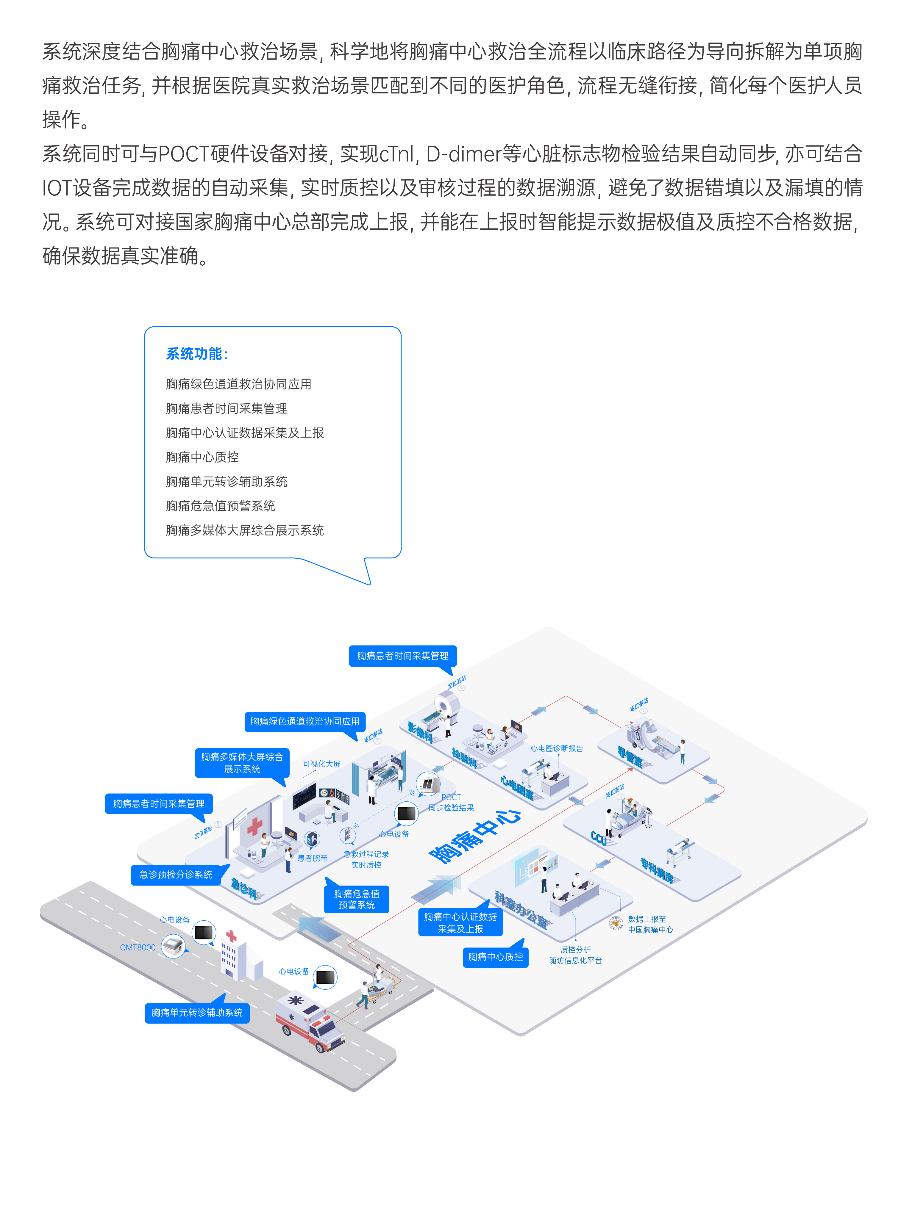 系統(tǒng)同時可與POCT硬件設(shè)備對接,實現(xiàn)cTnl,D-dimer等心臟標(biāo)志物檢驗結(jié)果自動同步,亦可結(jié)合IOT設(shè)備完成數(shù)據(jù)的自動采集,實時質(zhì)控以及審核過程的數(shù)據(jù)溯源,避免了數(shù)據(jù)錯填以及漏填的情況。系統(tǒng)可對接國家胸痛中心總部完成上報,并能在上報時智能提示數(shù)據(jù)極值及質(zhì)控不合格數(shù)據(jù),確保數(shù)據(jù)真實準(zhǔn)確。" />